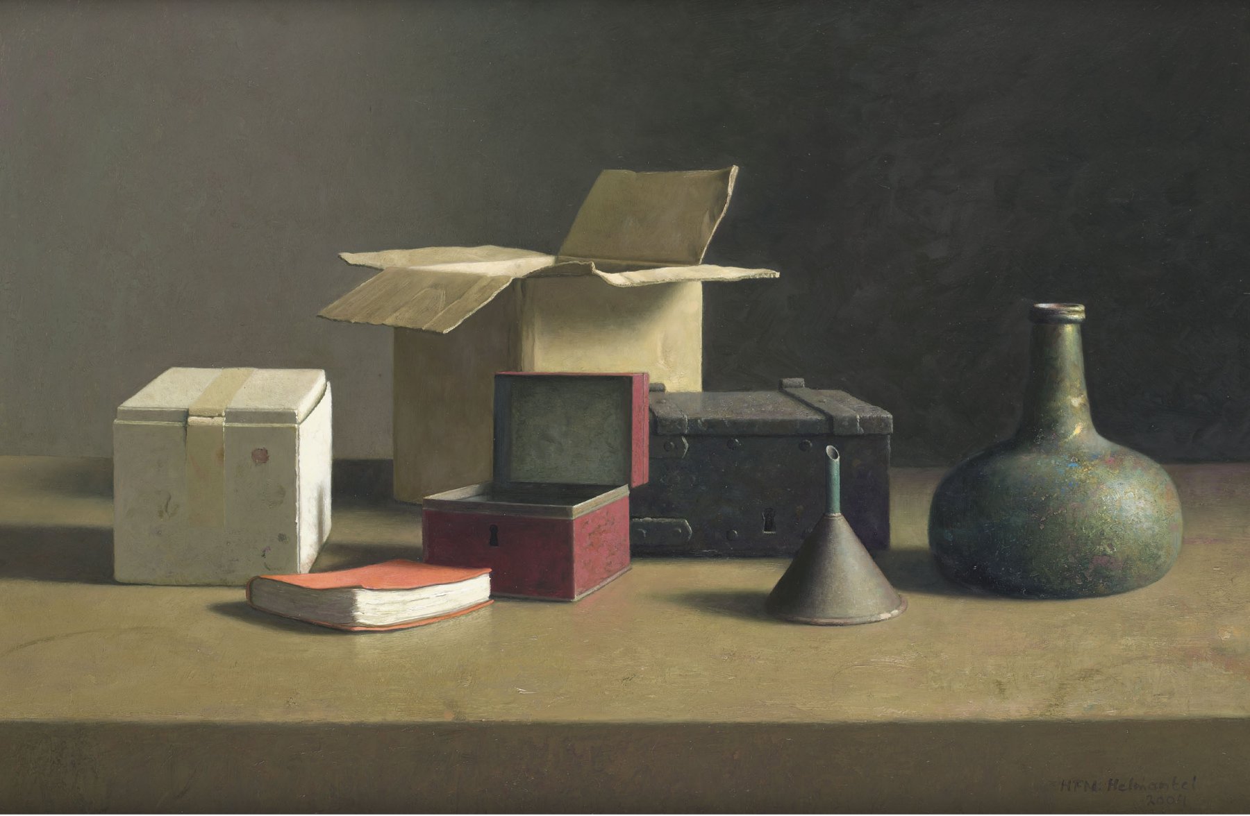 Stilleven met bewaardozen, trechter, fles en boek
