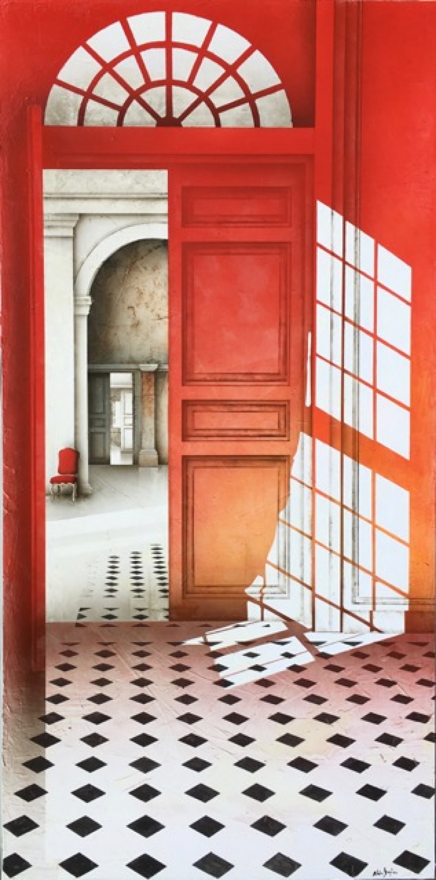 Quietly the viewers’ gaze is drawn through the deserted interiors created by Alain Gazier (1956). Silently the eye is led past the gleaming tiles on the floor to land, eventually, at the half opened door opening out to yet another room. The interiors in Gazier’s paintings are never inhabited, but human presence can be felt nonetheless. It seems like someone has just left the room. Or perhaps they have been gone for centuries. Who knows? Gazier uses a broad range of white hues in his paintings. A single element, often in the form of one or two velvet chairs, lead the eye to the background and deeper into the painting.